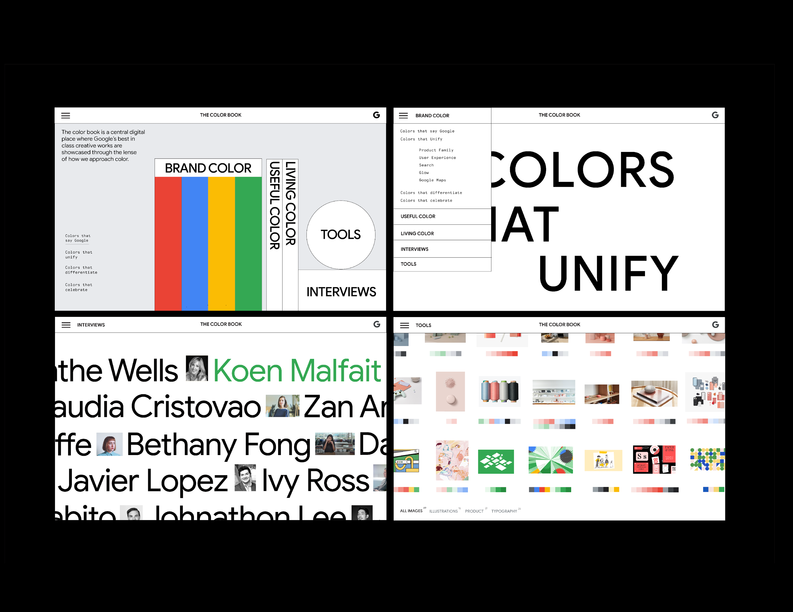 “The Color Book”, structured into three sections—Brand Color, Useful Color, and Living Color—curates a diverse range of Google case studies showcasing the strategic use of color. Its primary goal is to educate all internal Google employees on the effective utilization of color through a collection of successful projects in Brand design, UX design, and Product design.